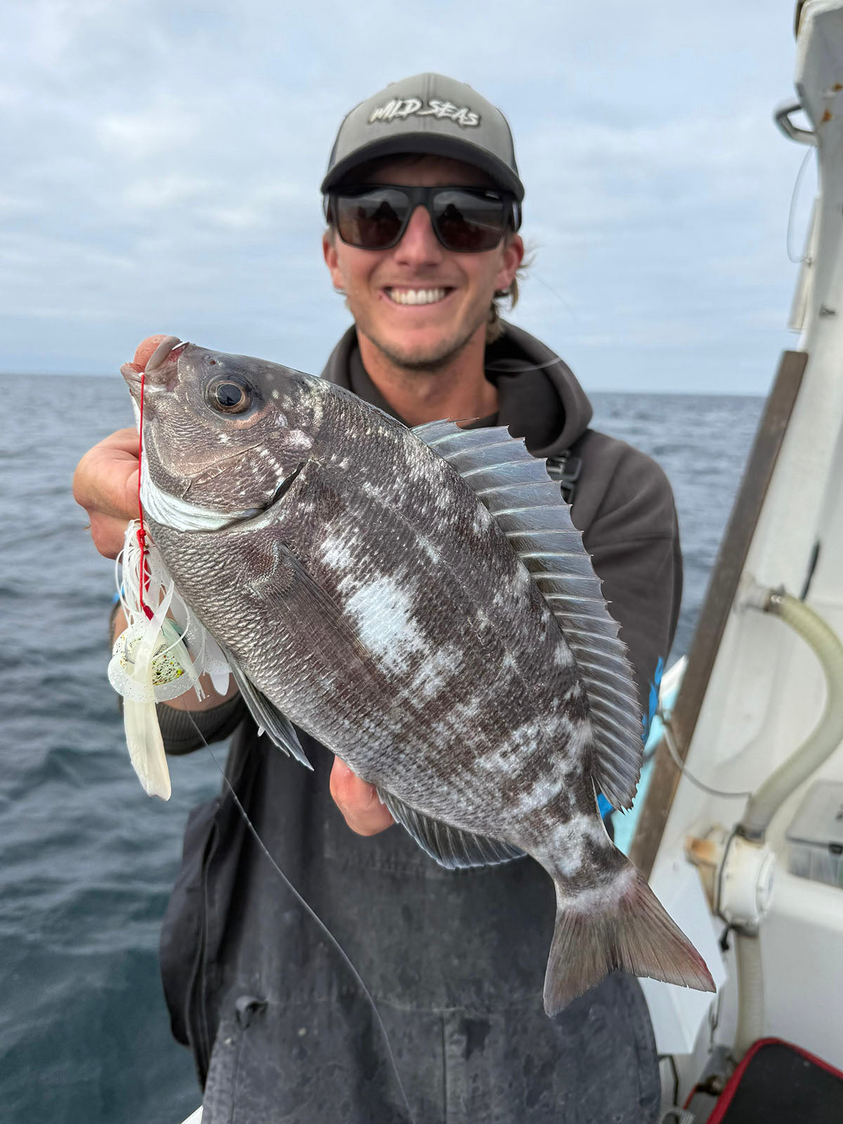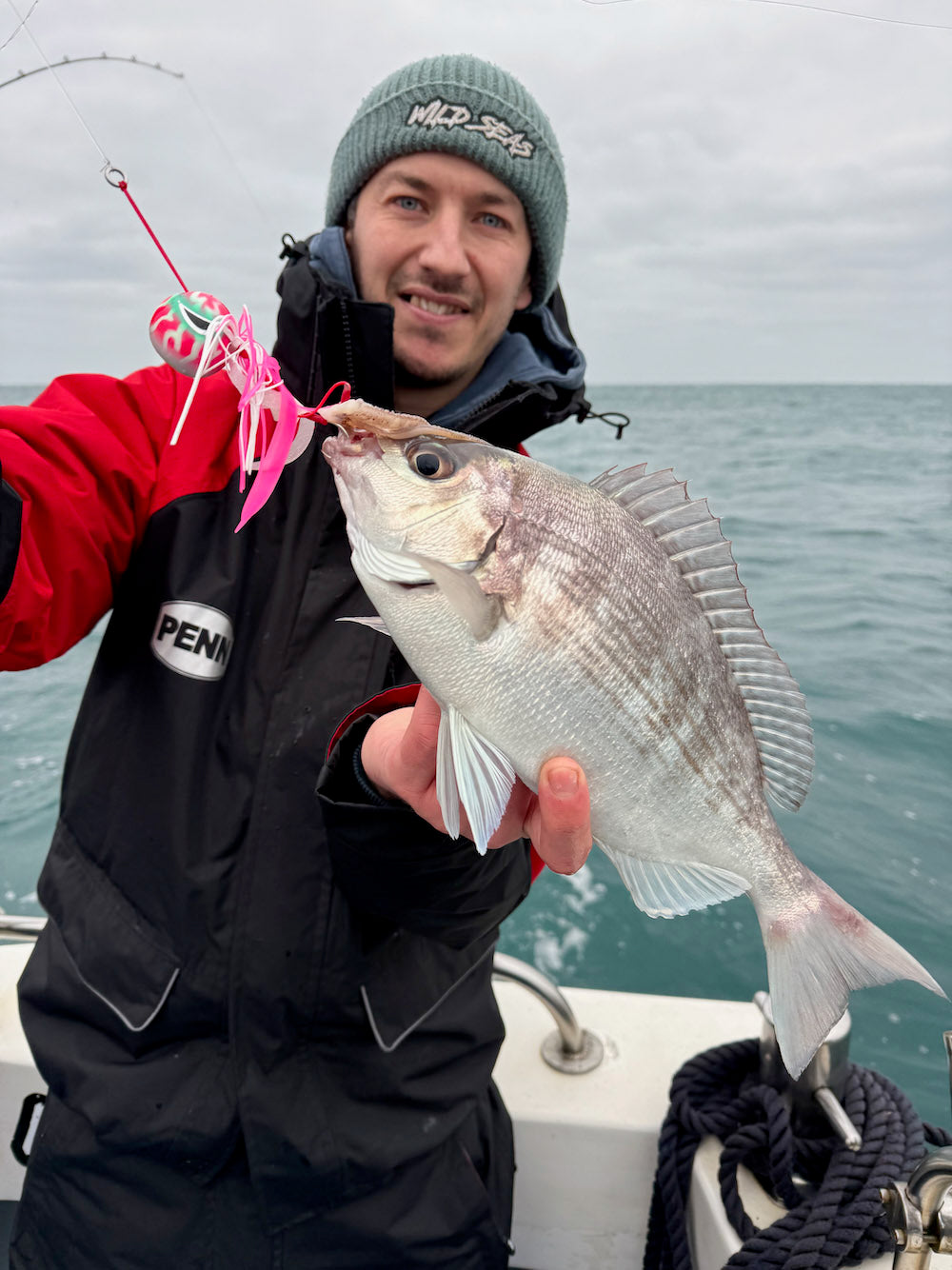 Liam used a 150g Kraken Kabura in 180ft of water to catch this Black Bream. The Pink Cuttle colour with glow stripes makes this jig stand out in the depths. Baiting Kabura jigs with stripes of squid proves deadly.